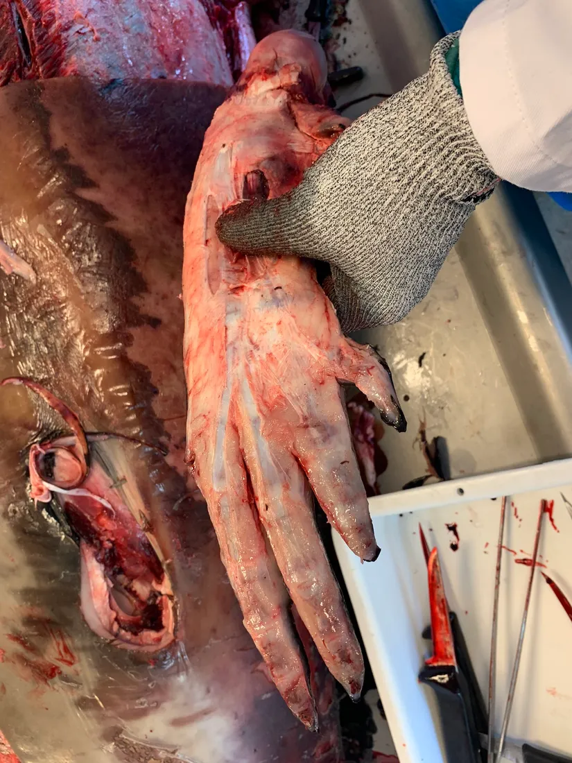 Örneğin; günümüzde yaşayan balinalarda (92 tür hariç) gerçek işlevini tamamen yirtirmiş (yani körelmiş) femur (uyluk kemiği) ve pelvis (leğen kemiği) kalıntıları bulunur. Bu yapılar, günümüzde yaşayan balinalara atalarından miras kalmıştır. Bu kemikler omurga ile bağı kopmuş halde vücut boşluğu içinde öylece dururlar. Dahası, balinaların pektoral (yani göğüs) yüzgeçlerinin içinde “kolları” vardır. Evet, yanlış okumadınız; bildiğiniz kol! Tıpkı primatlarda ve insanlarda olduğu gibi bu balinaların da kolları ve 5 parmaklı elleri var. İşte bir balina diseksiyonu sonucunda çıkarılan balina elinin görüntüsü: