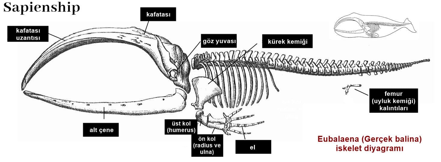 Günümüzde yaşayan bir Eubalaena‘nın (Gerçek balina) iskelet diyagramı: