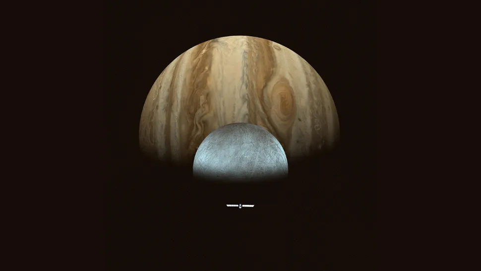 NASA’nın Europa Clipper uzay aracının Europa’ya yaklaştığını gösteren bir sanatçı tasviri. Görsel kaynağı: NASA/JPL-Caltech