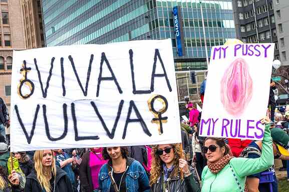 Kadınlar, vulva konusunda farkındalık yaratmak için yürüyüş yapıyorlar. Oakland, 2017. Görsel kaynağı: Flickr/jariceiii